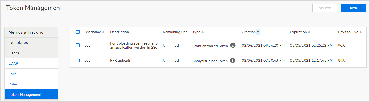 You can generate authentication tokens from either the ADMINISTRATION view in Fortify Software Security Center, or from the command-line interface. Only you can see the details of your tokens. A Fortify Software Security Center administrator can extend the life of a token you create, but not beyond the maximum days to live for that token.