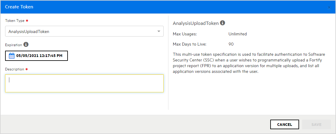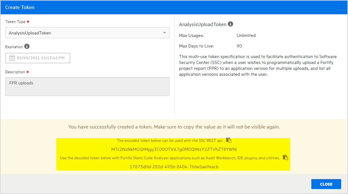 | ToolsConnectToken | Use this token with the Fortify Static Code Analyzer applications (including Audit Workbench, IDE plugins, and utilities) that connect to Fortify Software Security Center for collaborative auditing, remediation, and uploading of scan results. |