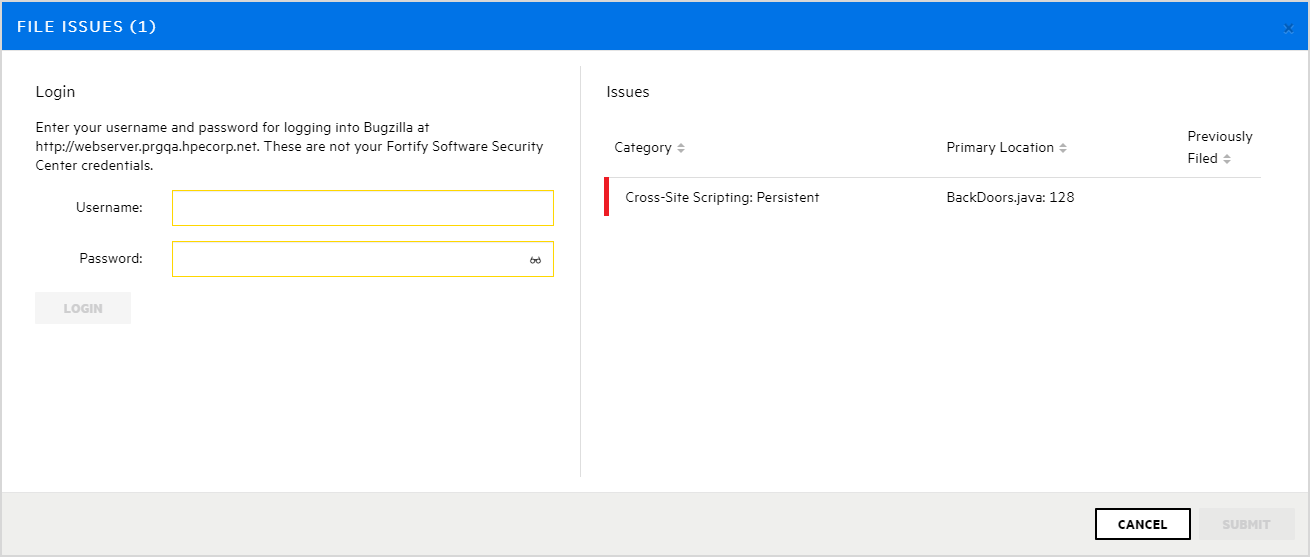 In the FILE ISSUES (1) dialog box, under Login, provide the username and password for the bug tracker associated with this application version, and then click LOGIN.
