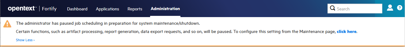 If, for any reason, you need to shut down the server, you can temporarily pause user activity and disable the running of new jobs for all users in the system, while allowing Fortify Software Security Center to just finish jobs in progress. This helps to ensure that no data are corrupted or lost when the server is shut down.