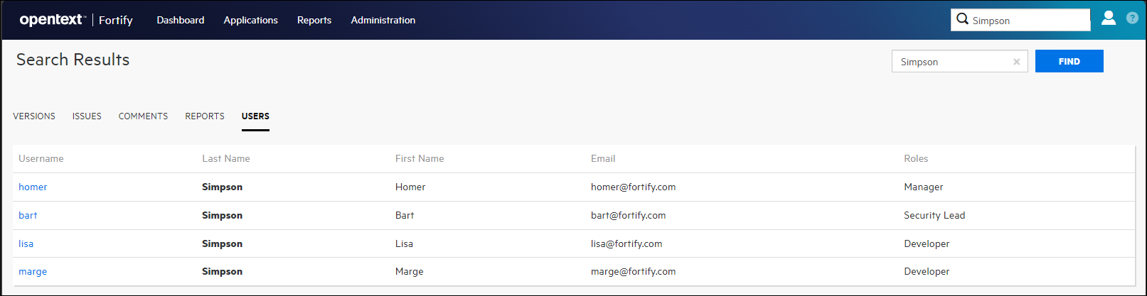 Regardless of where you are in the Fortify Software Security Center user interface, you have access to the global Search field on the OpenText header. Any search string you type here is applied across all application versions, issues, reports, comments, and users.