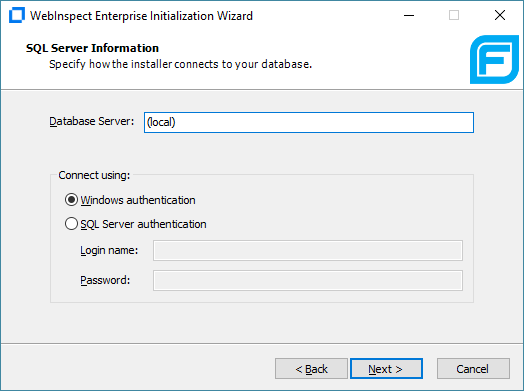 Enter the name of the SQL Server instance in the Database Server field and select the authentication that will be used. If you are installing Fortify WebInspect Enterprise for the first time, you must have privileges to create a database (or your database administrator must create a blank database and assign ownership to you).