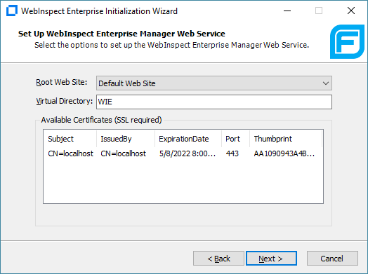 Note: After you complete these installation procedures, you will always be able to restart the Initialization Wizard if necessary, by clicking Start > All Programs > Fortify > Fortify WebInspect Enterprise 21.1.0 > WebInspect Enterprise Initialize.