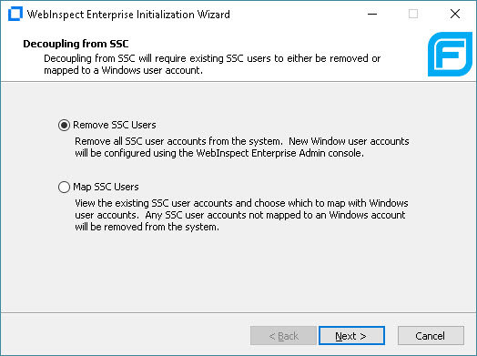 Otherwise, the current user is added as the first Fortify WebInspect Enterprise system administrator and the procedure continues with the Decoupling from SSC window after Step 3.