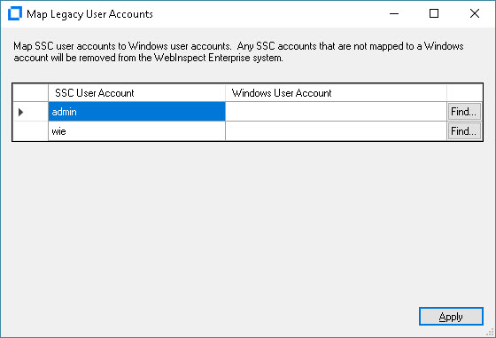 Important! Decoupling Fortify WebInspect Enterprise from Fortify Software Security Center is permanent. Reconnecting to Fortify Software Security Center is not supported. You can choose to map existing Fortify Software Security Center users to Windows accounts, allowing mapped user accounts to continue using Fortify WebInspect Enterprise.