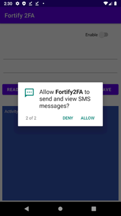 A prompt requests permission to send and view SMS messages.