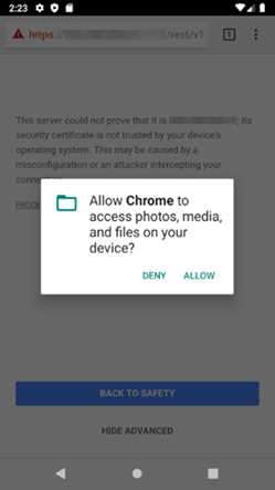 A prompt requests access to photos, media, and files on the device.