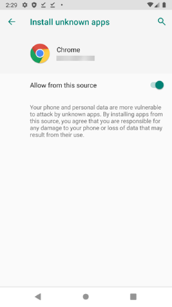 A prompt advises about installing unknown apps.