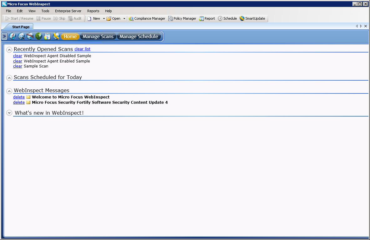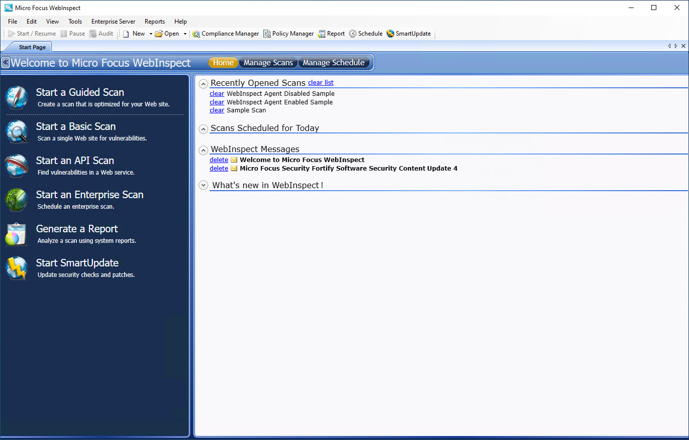 When you first start Fortify WebInspect, the application displays the Start Page as illustrated below.