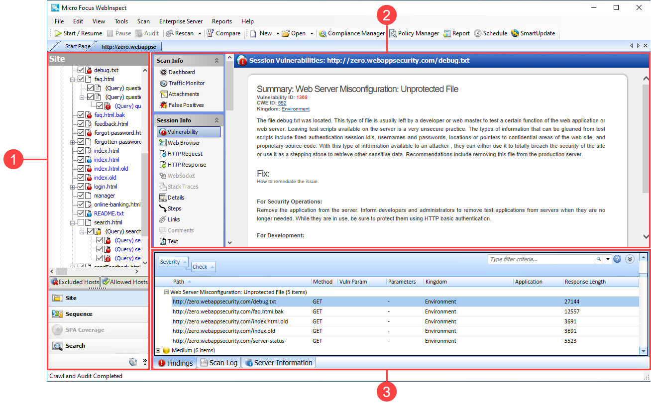 Each time you open or conduct a scan, Fortify WebInspect opens a tab labeled with the name or description of the target site. This work area is divided into three regions, as depicted in the following illustration.