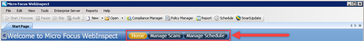When Home is selected (the default), Fortify WebInspect displays a list of: