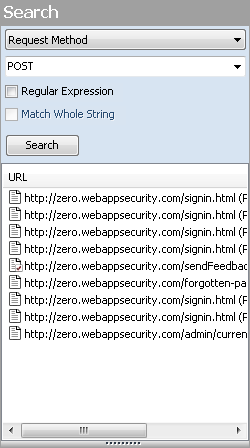 The Search view allows you to search across all sessions for various HTTP message components. For example, if you select Request Method from the drop-down list and specify POST as the search string, Fortify WebInspect lists every session whose HTTP request uses the POST method.
