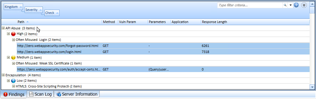 All findings in the group are selected. In the following image, for example, findings are grouped by Kingdom, then Severity, and then Check. The API Abuse group is selected, so all findings in that category are selected.