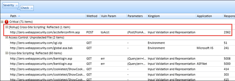 If you click OK, the selected vulnerabilities are rolled into a single instance and the check name is prefixed with the tag “[Rollup]”, as shown below. Additionally, a note is added to the Attachments on the Session Info panel detailing the URLs that were rolled up and affected by the same vulnerability. For more information, see Viewing Notes for a Selected Session.