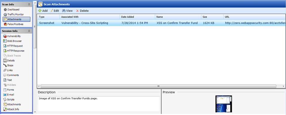 The Attachments selection displays a list of all session notes, vulnerability notes, flags for follow-up, and vulnerability screenshots that have been added to the scan. Each attachment is associated with a specific session. This form also lists scan notes (that is, notes that apply to the entire scan rather than to a specific session).