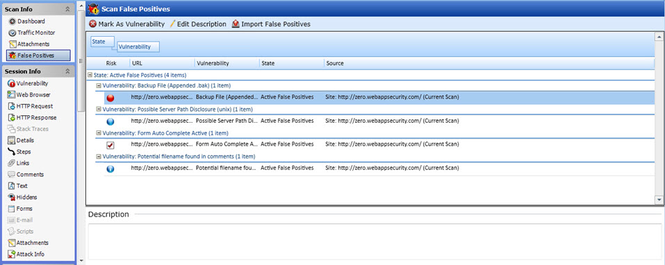 You can import from a previous scan a list of vulnerabilities that were identified as being false positives. Fortify WebInspect then correlates these false positives from a previous scan with vulnerabilities detected in the current scan and flags the new occurrences as false positives.