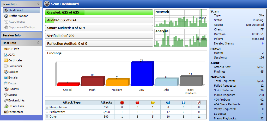 Number of sessions audited using smart audit / total number of sessions for smart audit. For smart audit, OpenText DAST detects the type of server on which the Web application is hosted. OpenText DAST runs checks that are specific to the server type and avoids checks that are not valid for the server type. |