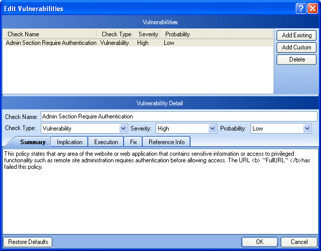 To modify the vulnerability, select different options from the Vulnerability Detail section. You can also change the descriptions that appear on the Summary, Implication, Execution, Fix, and Reference Info tabs.
