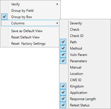 Filter by Current Value - Restricts the display of vulnerabilities to those that satisfy the criteria you select. For example, if you right-click on "Post" in the Method column and then select Filter by Current Value, the list displays only those vulnerabilities that were discovered by sending an HTTP request that used the Post method.