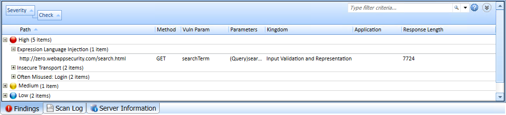 The Findings tab lists information about each vulnerability discovered during an audit of your web application.
