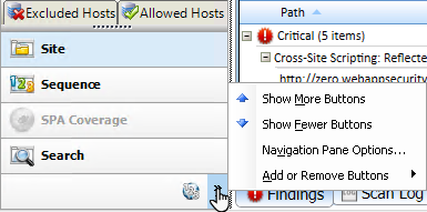 When conducting or viewing a scan, the navigation pane is on the left side of the OpenText DAST window. It includes the Site, Sequence, SPA Coverage, Search, and Step Mode buttons, which determine the contents (or "view") presented in the navigation pane.