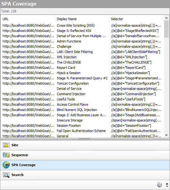 The SPA Coverage view is available only if SPA support is enabled for a scan. This view displays the elements in the page that the crawler interacted with during the crawl.