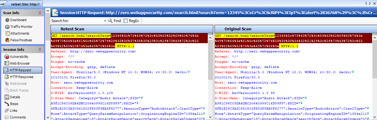 When you select a vulnerability in a retest scan, you can view certain data from both scans in a dual-pane view. Select HTTP Request, HTTP Response, or Steps to display a dual pane view comparing the retest scan to the original scan. If the original scan is not available, only the data for the retest scan is displayed.