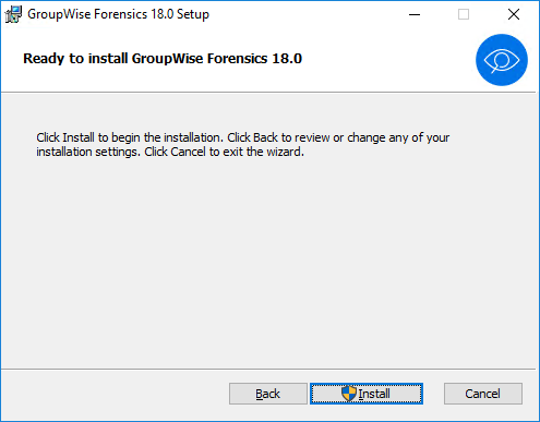 The Install Wizard is now ready to create your GroupWise Forensics folder. Click Install to place a copy of the GroupWise Forensics software on your workstation. Clicking Back or Cancel will leave your computer unchanged.