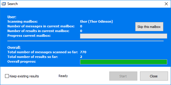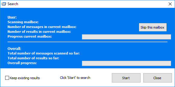 The search window will appear and require the user to select the Start button. Searches on large mailboxes may take some time. Select the Start button to continue.
