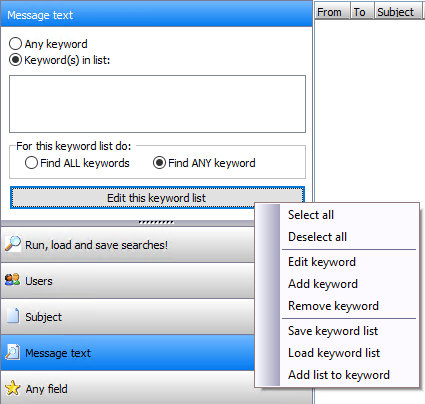 The Keyword list panel is used for the Subject, Message Text, Any Field, Sender, Recipient(s), and Attachments criteria. Each search criteria requires the specified keywords under that search tab to be found in their respective areas.