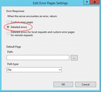 Wenn Webserverfehler ausgegeben werden, kann das Problem durch Aktivieren der detaillierten Fehler diagnostiziert werden. Öffnen Sie in IIS-Manager die Funktion Fehlerseiten, und aktivieren Sie Detaillierte Fehler: