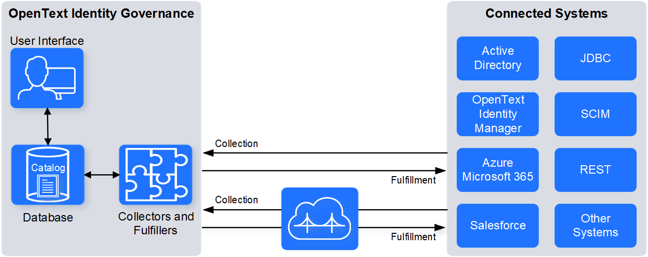 OpenText Identity Governance collects information from various identity and application data sources including OpenTextâ„¢ Identity Manager and guides authorized users through the key phases of the governance process. You can install OpenText Identity Governance on premises or access it as a service, and then collect data from cloud and on-premises data sources and send change requests to fulfillment targets. When using OpenText Identity Governance as a service and collecting data from on-premises systems, you will need to install the Cloud Bridge Agent and configure data source connections in OpenText Identity Governance.