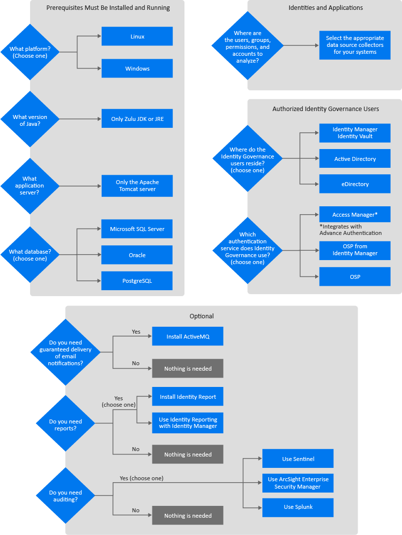 There are many decisions that you must make before you can start the installation of Identity Governance. Identity Governance has many options to allow you to add it to your IT environment. There are some main high-level choices you must make to properly install and configure Identity Governance. Use the following Figure 2-1 to make the decisions that are appropriate for your environment and then use the worksheet in Table 2-1 to capture those choices.