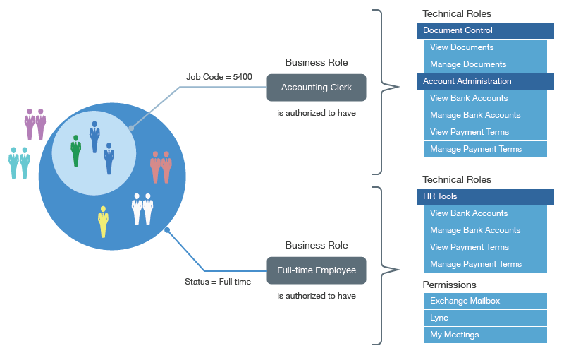 Business roles organize people by business function, and user-based attributes to determine what users should have access to, or if they can request that access without additional approval. Business roles authorize resources (permissions, technical roles, and applications) for users who are members of the business role. These authorizations also specify whether resources are to be auto-granted to users, auto-revoked from users, or should not be auto-granted and auto-revoked.