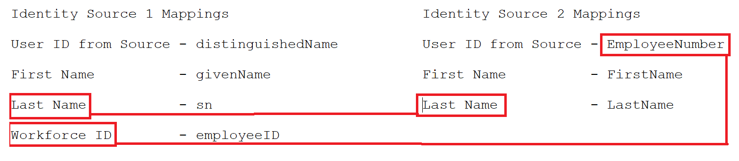 To ensure that you can create a unique identity from the data that you collect, you can tell Identity Governance how to map the data collected from an application to the data that you collect from identity sources. Collect as much information as you need to fulfill your business needs. Also ensure that you collect enough information to allow application account and permission data to be joined to your identities. Some common join attributes that are available from most application sources include email address, workforceId, and name attributes.