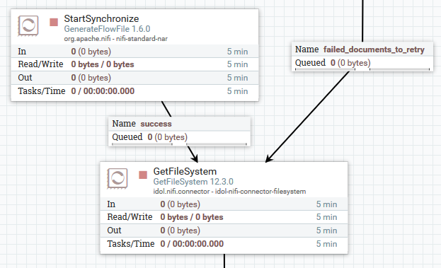 - If the processor has an incoming connection it runs only when there is a FlowFile in the input queue. The connector reads the identifier (a unique value that is assigned by the connector) of the incoming document and attempts to retrieve that document from the repository again. If the source data is retrieved successfully the connector discards the FlowFile that it received and outputs a new FlowFile to the success relationship. If the source data is not retrieved successfully the connector outputs the FlowFile it received to the failed identifiers relationship.