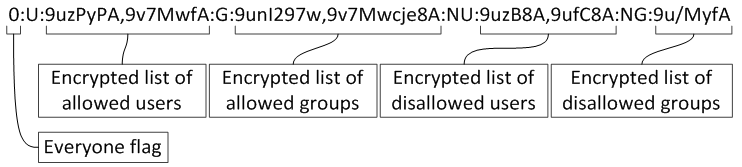 These sections each hold comma separated lists of encrypted strings. Each string holds a user name or the name of a group, for example: