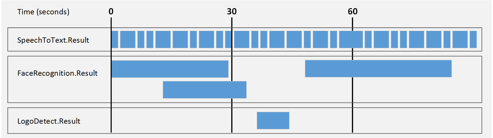 For example, if you run logo detection on a news broadcast, the news logo could be present on screen continuously for an hour. In that case, Media Server does not output any data until the logo disappears. Although Media Server creates documents that each represent 30 seconds of content, all of the documents are output at the end of the hour when the record describing the logo finishes.