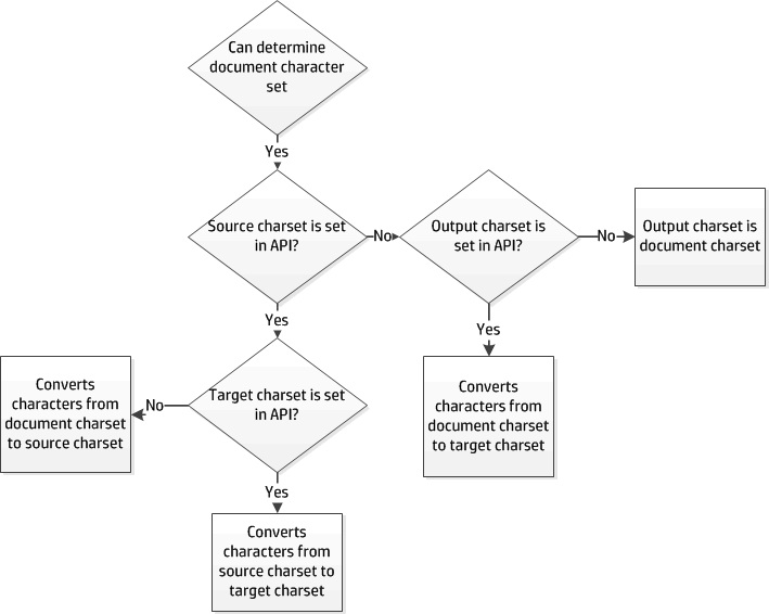 If character set information cannot be determined for your document type, you must set the source, the target character set, or both, in the API.