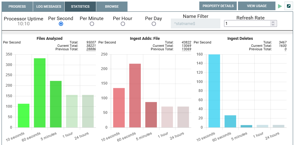 The image above is from a GetFileSystem processor. The charts show the number of files processed per second, averaged across the last 10 seconds, 60 seconds, 5 minutes, and so on. You can see the rate in files per second, per minute, per hour, or per day by clicking the relevant option at the top of the dialog.