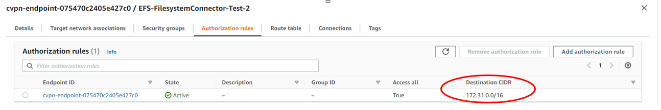 9. Add an authorization rule allowing access to all users for the associated VPC subnet CIDR. This is done by taking the VPC subnet IPv4 CIDR information and creating an authorization rule on the client VPN endpoint and entering in the VPC subnet IPv4 CIDR as the Destination CIDR of the authorization rule.