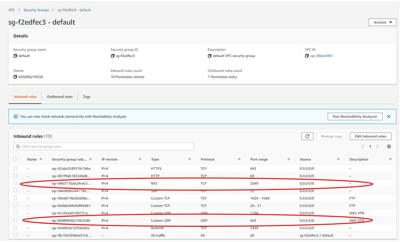 10. Ensure that UDP port 443 and NFS port 2049 inbound rules are present in the client VPN endpoint security group.
