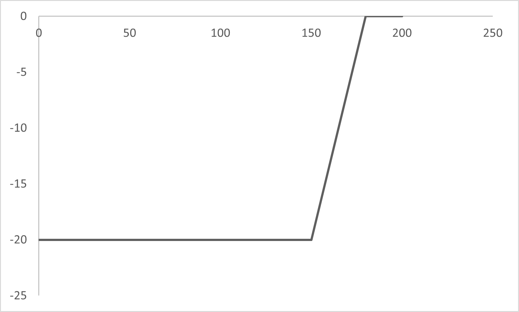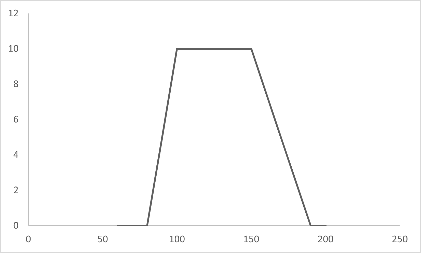 A document whose PRICE field value is between 100 and 150 has its weight decreased by 20%. This penalty decreases linearly to 0% at 70 and lower, and 180 and higher.