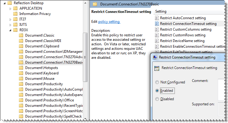 The Restrict ConnectionTimeout setting policy is Enabled. This setting for 3270 display sessions is restricted.