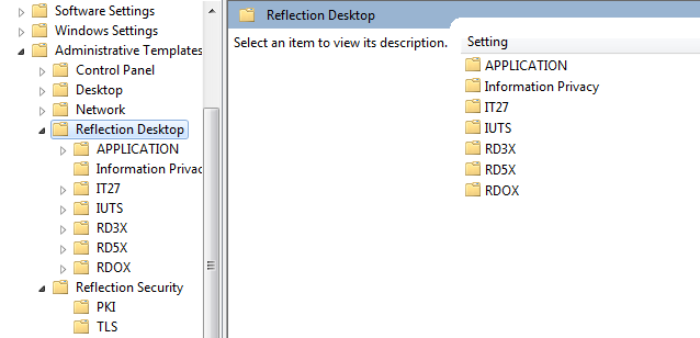 Under either Computer Configuration or User Configuration, browse to Administrative Templates | Reflection Desktop or Administrative Templates | Reflection Security.
