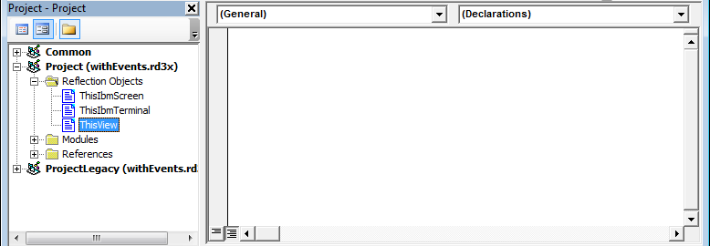 Then set up your macro to handle events for the InfoConnect objects. The default InfoConnect objects in the Visual Basic editor (such as ThisIbmScreen or ThisScreen) are not available for the new session while you are programming, so you'll need to set up variables for these objects using the VBA WithEvents keyword. The easiest way to declare these variables is to place them in the object module in which you are writing the macro (For example, ThisIbmScreen or ThisScreen for InfoConnect or ThisWorkbook or Sheet for Excel).
