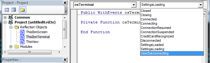 'Declare this variable in a default object code window Public WithEvents osTerminal As Attachmate_Reflection_Objects_Emulation_OpenSystems.terminal |