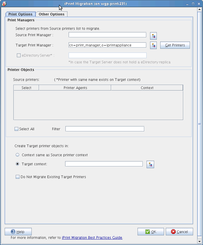 The Target Print Manager field is populated with the name of the active Print Manager running on the target server. This field is editable; you can also specify a different name for the active Print Manager. To go directly to a context of your choice, specify the context in the search base and click Search. The objects in the specified context are displayed. Click Get Printers to select printer objects from the source Print Manager. |