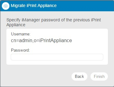 The iManager user name field is pre-populated and not editable. Specify the iManager password that was used to configure the earlier version of the iPrint Appliance. This password will be used to log in to the iManager for managing the print environment.