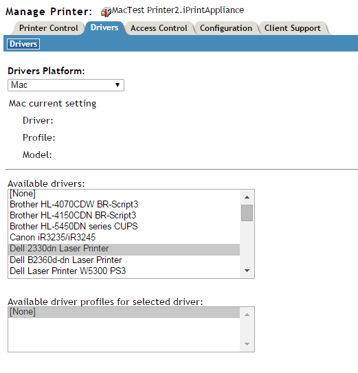 Use the Drivers Platform drop-down list to select the client platform for which you want to set the printer driver for the selected printer.